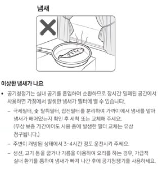 제조사의 사용설명서를 보면 냄새가 심한 조리 시 전원을 끄고 냄새가 완전히 제거된 후 사용하라고 되어 있습니다.