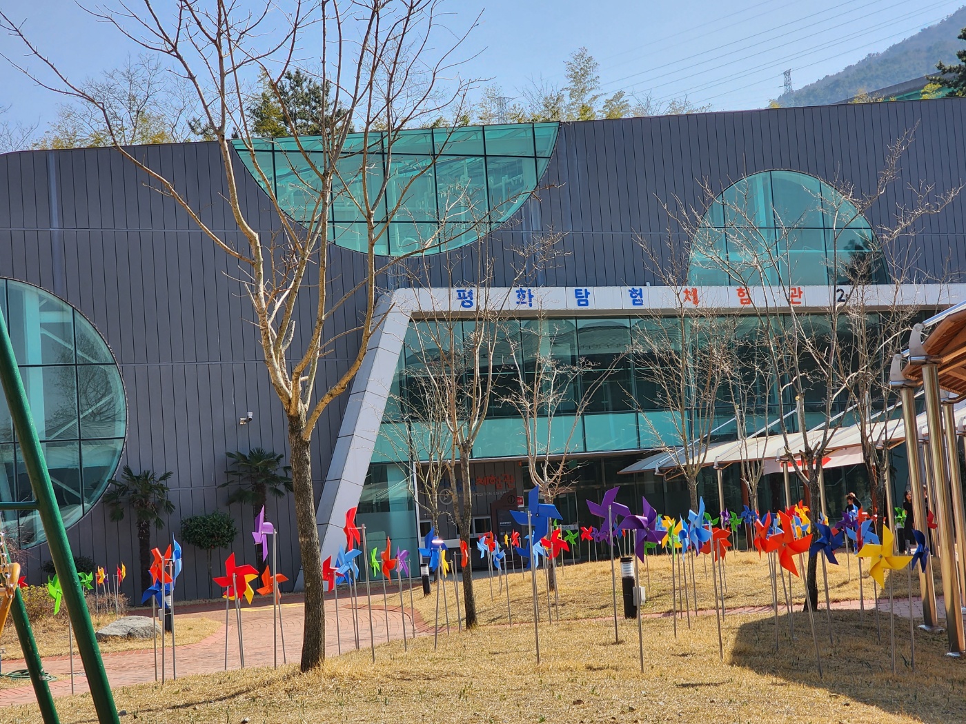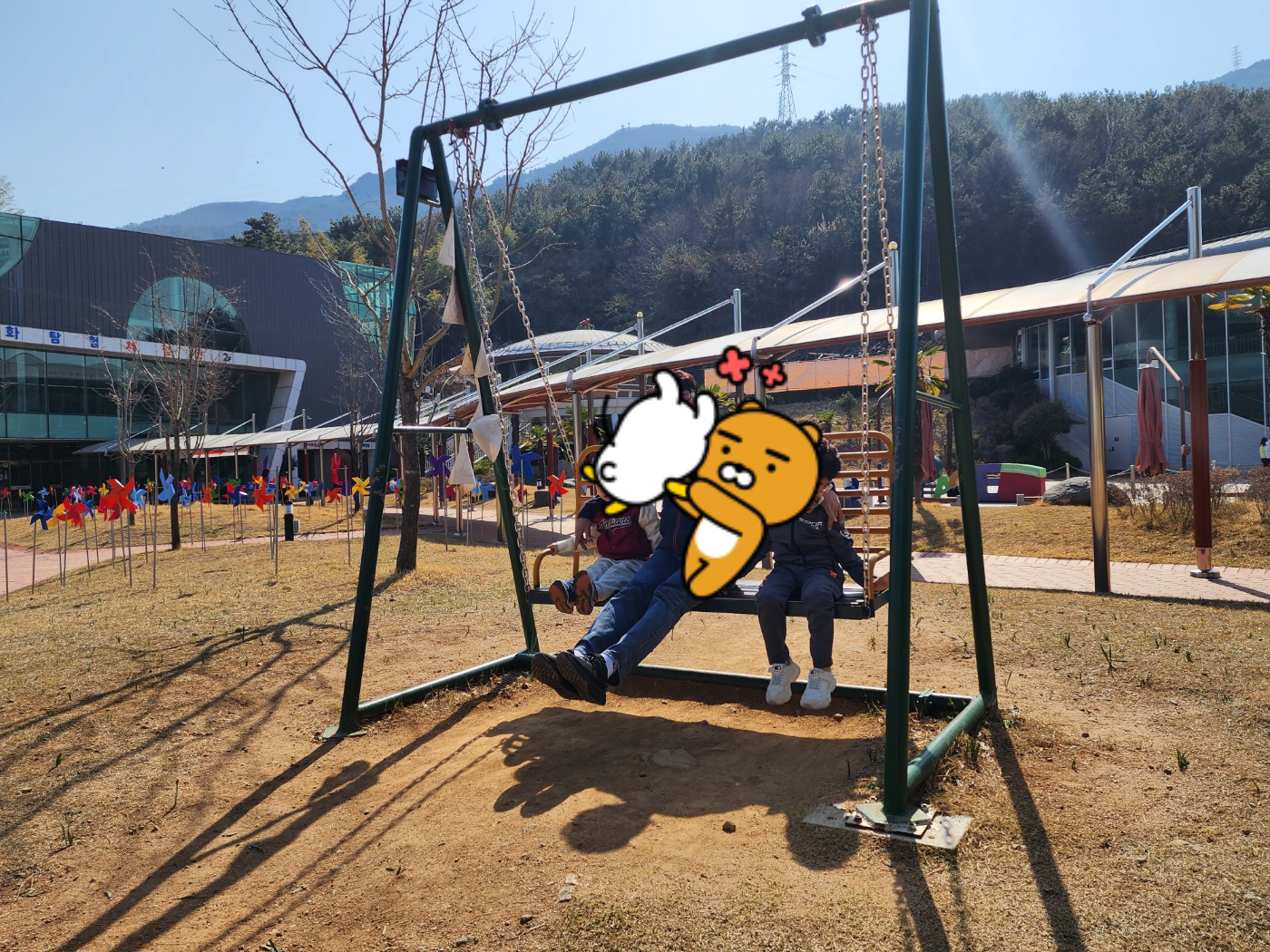 어드벤처 센터 앞에서 예쁜 바람개비와 그네를 타는 아이들.