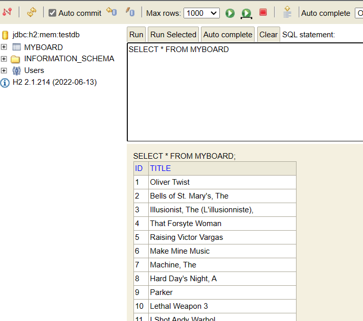연결을 클릭하여 데이터베이스에 연결하면 myboard 테이블이 생성되고 데이터가 올바르게 입력되었는지 확인할 수 있습니다.