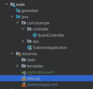 data.sql에 테이블을 생성하는 SQL과 테스트 데이터를 삽입하는 SQL을 입력합니다.